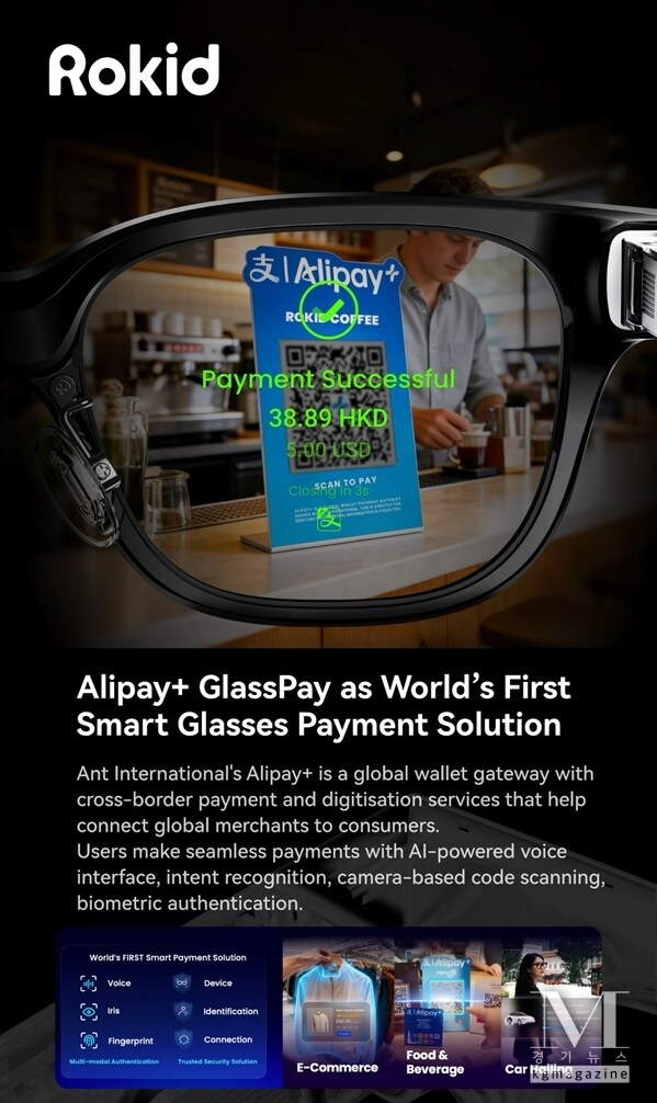 [ 경기뉴스매거진 ] 라스베이거스 2026년 1월 9일 -- 인간과 컴퓨터 간 상호작용과 증강현실 분야를 선도하는 기업 로키드(Rokid)가 글로벌 디지털 결제, 디지털화 및 금융 기술을 선도하는 기업 앤트 인터내셔널(Ant International)과 전략적으로 협력하여 최근 CES 2026에서 전 세계 최초로 공개된 세계 첫 오픈 생태계 AI 스마트 글래스 Rokid Glasses와 Rokid Ai Glasses Style에 결제 기능을 탑재한다고 밝혔다. 이는 AI 기반 웨어러블 기술의 실제 활용 분야를 확대하기 위한 포석이다.